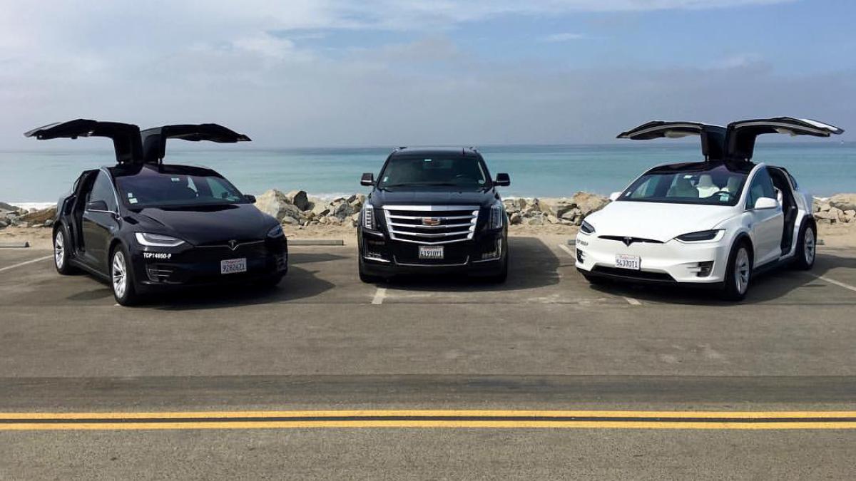 Their fleet includes a 7-Seat Cadillac Escalade ESV, a white on white and black on black Tesla Model X with falcon-wing doors that seats six guests.