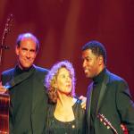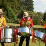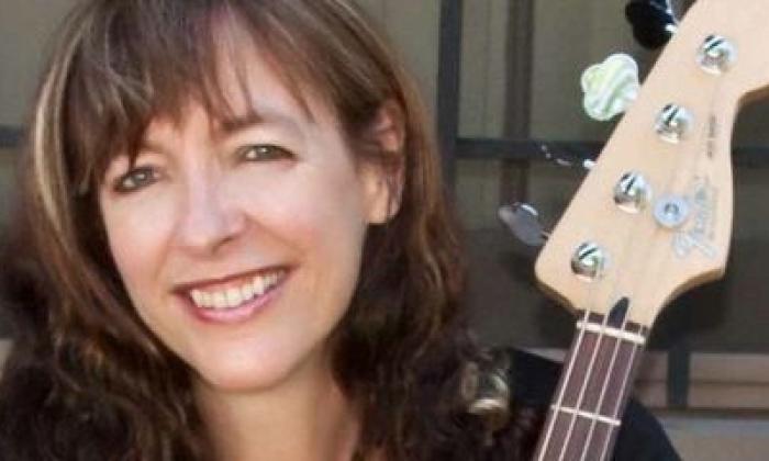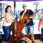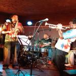 Three musicians, a bass player, harmonica player, and guitarist performing together at an open mic