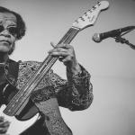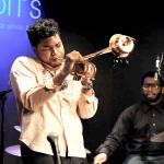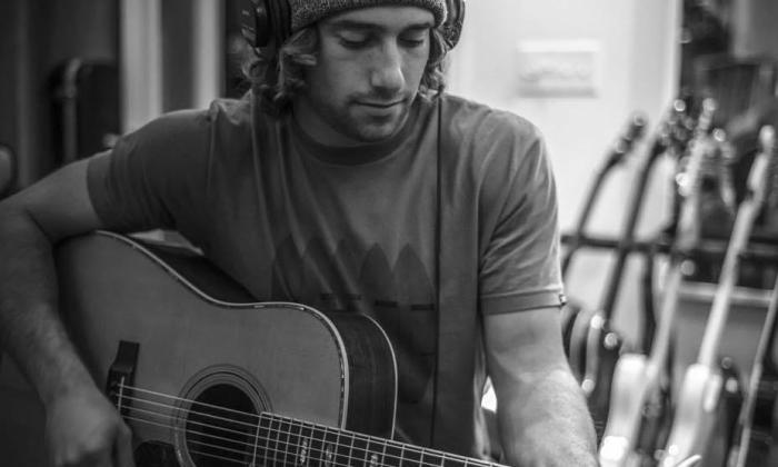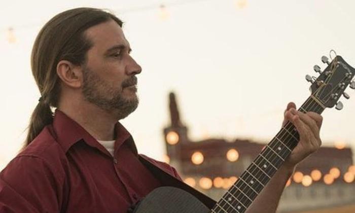 Singer and songwriter Denny Blue performing with guitar and harmonica. Courtesy of Terry Bottom