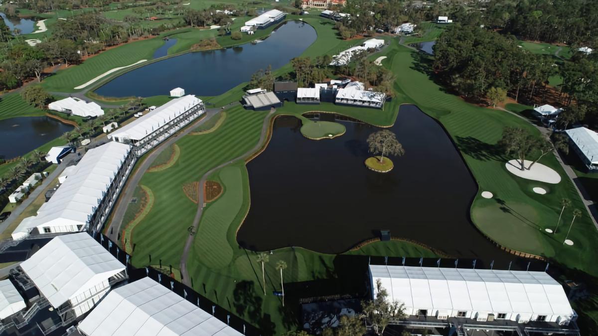 Aerial view of the iconic par-3 17th hole at The Players Stadium Course at TPC Sawgrass