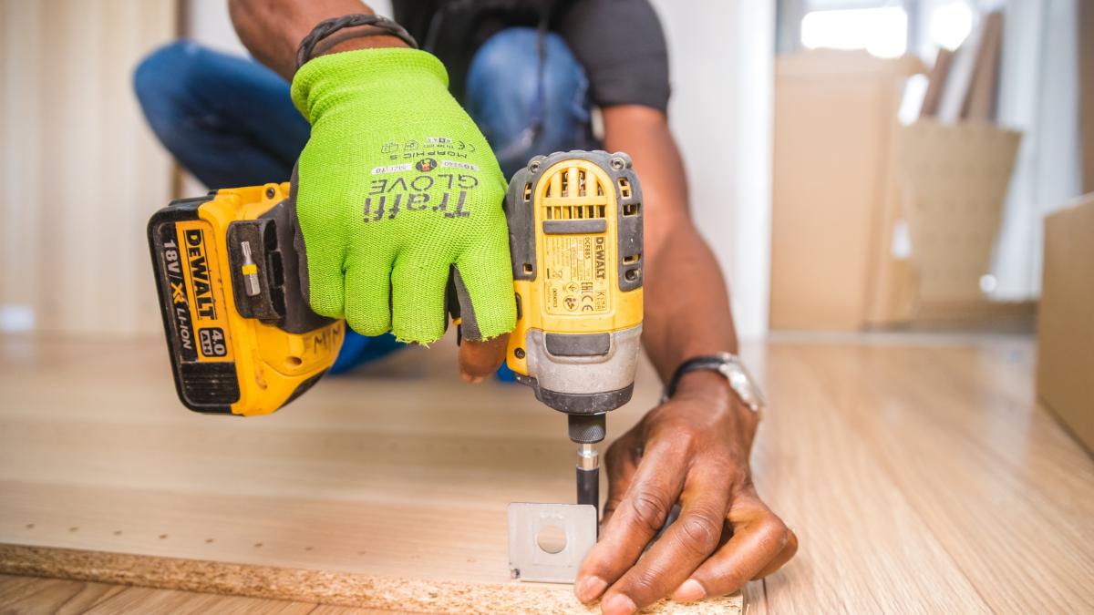 The hands of a handyman as he fastens a floor to the subfloor