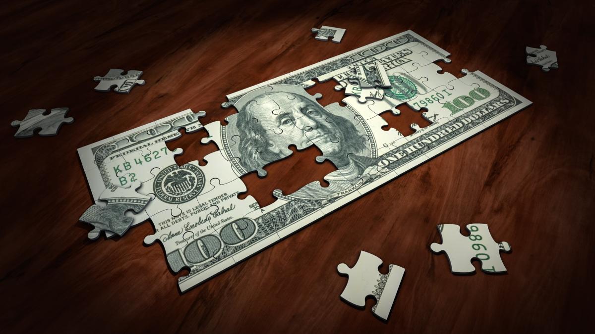 A partially completed puzzle of a one hundred-dollar-bill on a dark wood table