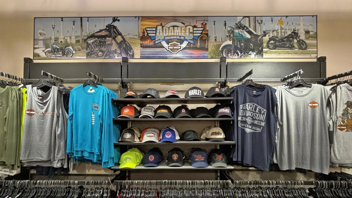 Adamec Harley-Davidson, at 118 St. George Street in Historic Downtown, supplies quality Harley-Davidson apparel and merchandise for Harley-Davidson enthusiasts.