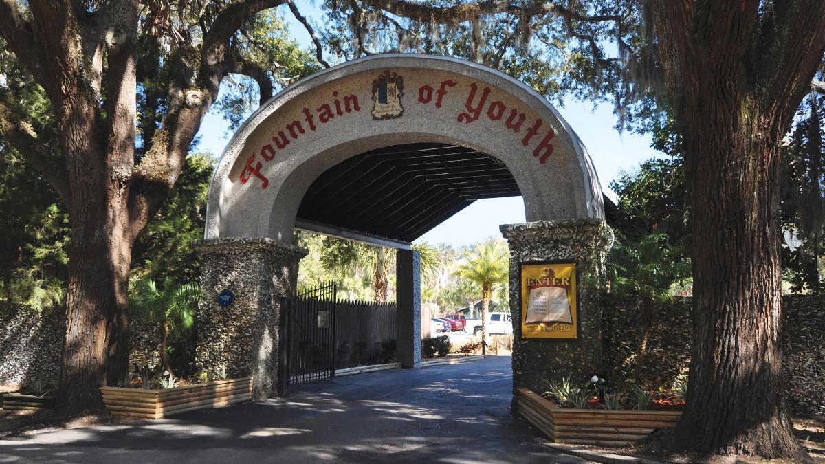 The entrance to the Fountain of Youth through an arched sign