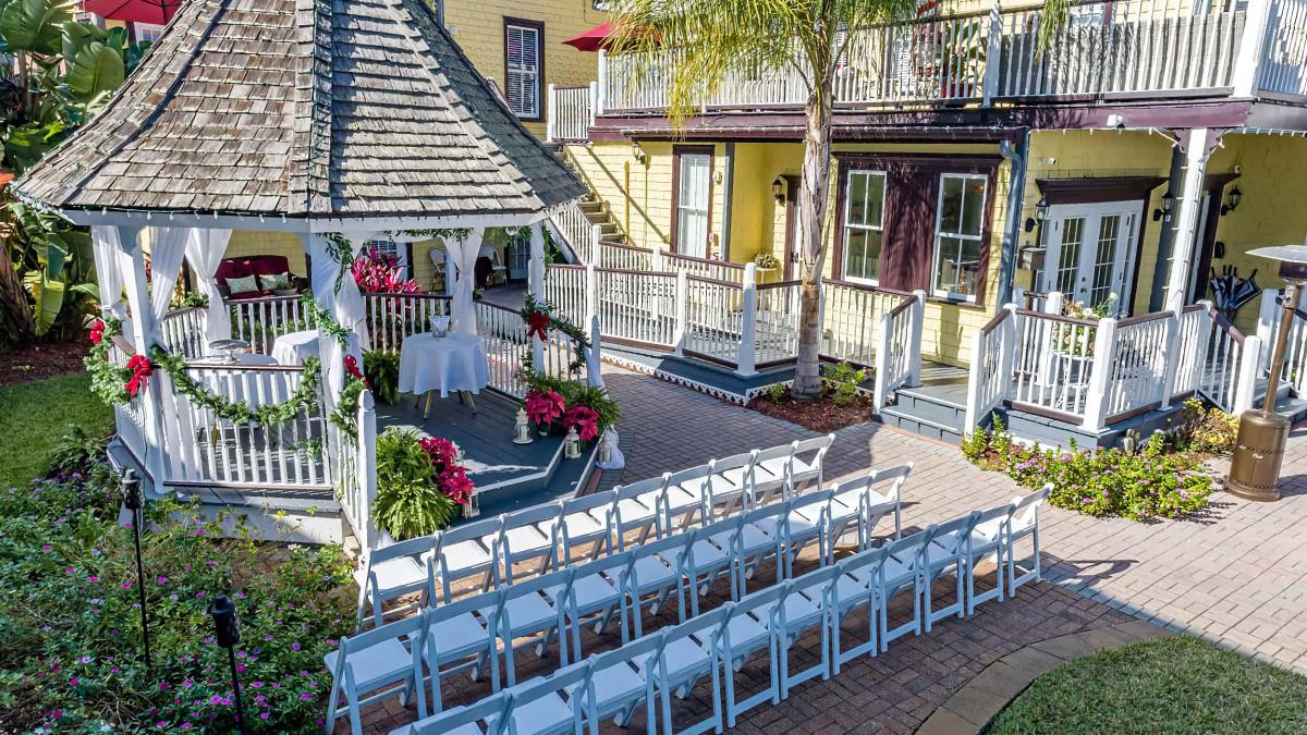 Options include a Victorian gazebo adorned with sheer curtains, an intimate ceremony on the sands of Vilano Beach, or a wedding and reception in the stone-wall-enclosed secret courtyard of a historic home, built in 1790.