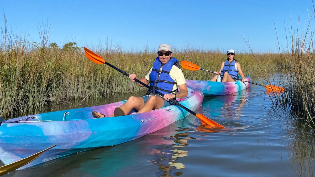 On the Sunset Kayak Tour, a two-hour paddle during the golden hour led by an experienced guide, see wildlife such as wading birds, marsh creatures, and perhaps a dolphin (if you are kayaking on the river side). The trip starts just before the setting sun paints the sky and the water with golden and orange hues.