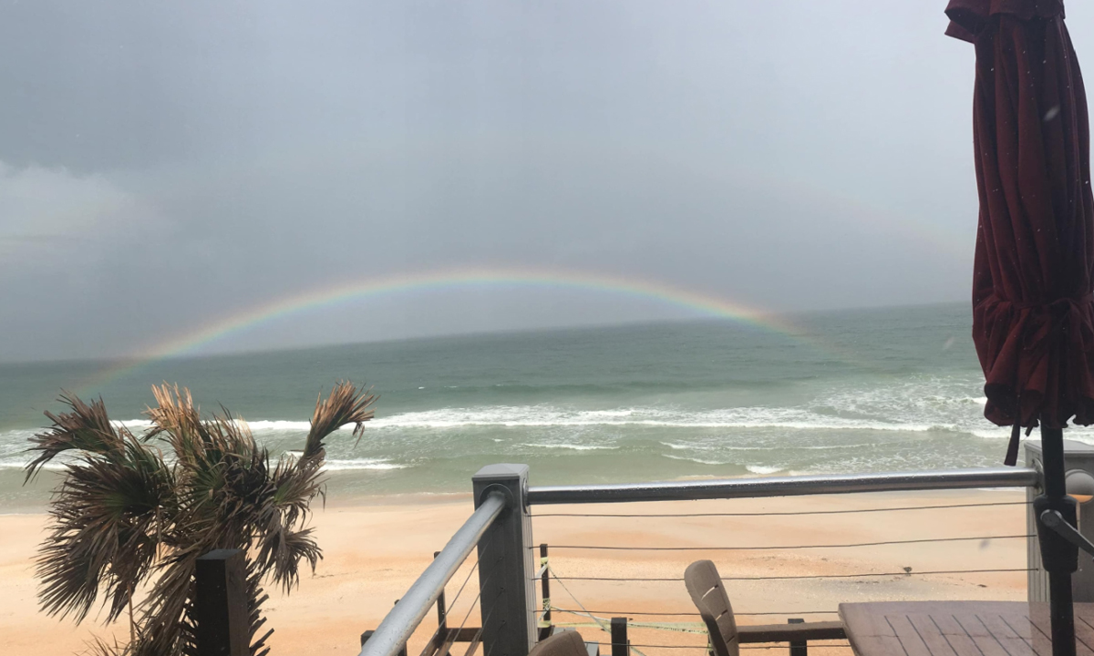 Photo of The Reef Restaurant's back deck, beach, and rainbow.
